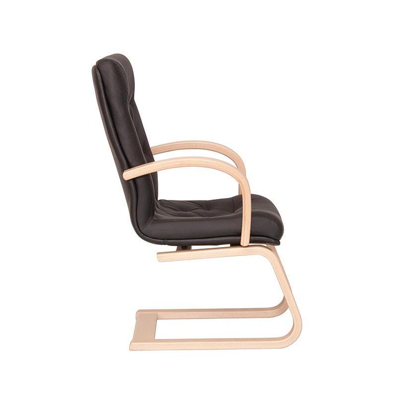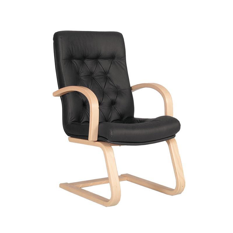FIDEL lux extra CF LB - конференційна версія лінії FIDEL. Широке сидіння і ергономічна спинка декоровані в техніці капітоне з використанням шкіряних гудзиків. Підлокітники вигнутою форми виготовлені з дерева (масив бука), до замовлення доступний широкий вибір кольорів. Модель виконана на дерев'яних полозах в тон підлокітників. У даній модифікації крісло комплектується низькою спинкою.