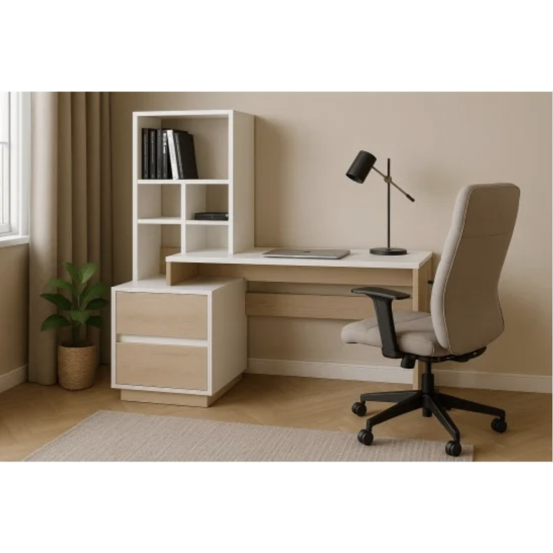 Виготовлений із якісної ламінованої ДСП, стіл відзначається довговічністю і стійкістю до щоденного використання. Велика стільниця та ніші для зберігання забезпечують комфорт і порядок, а екологічно безпечні матеріали роблять його придатним як для дорослих, так і для дітей.