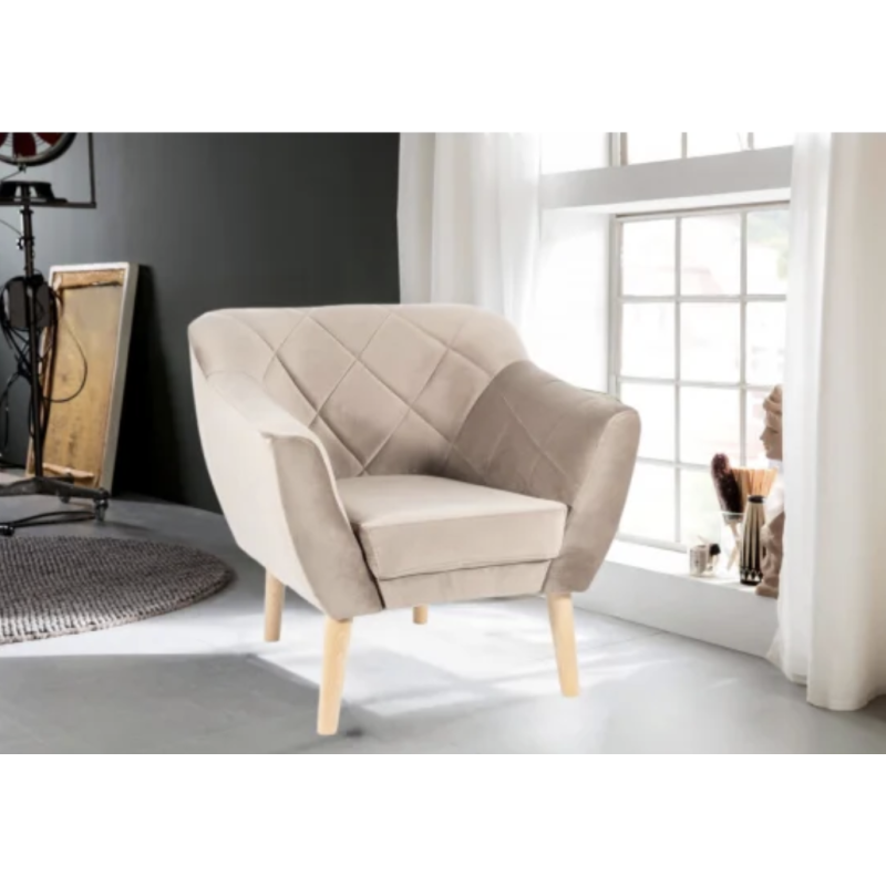Крісло KARO 1 VELVET (темний беж / бук, BL.40) — елегантне м’яке крісло, яке поєднує комфорт і сучасний стиль. Оббивка з бархатної тканини дарує приємні тактильні відчуття, а дерев’яний каркас із бука забезпечує надійність і довговічність. Ідеально підходить для вітальні, спальні чи зони відпочинку.