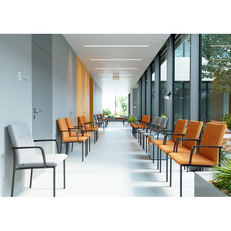 Выполнены в разных конфигурациях: на полозьях, на крестовине с колесиками, на 4-х ножках. Так же есть выбор подлокотников. Широкий ассортимент тканей позволит Вам обставить любой интерьер. Так же к этой модели, отдельной опцией можно дополнительно заказать antipanic safety lock – навеска стульев в ря