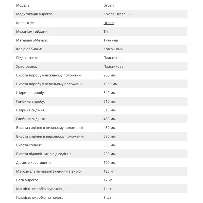 Крісло Urban — стильне офісне чи домашнє крісло з доступною ціною та комфортним дизайном. Має пластикові підлокітники з м’якими накладками, ергономічну спинку та регулювання висоти сидіння. Модифікація Urban LB оснащена механізмом гойдання Tilt, який дозволяє фіксувати крісло у робочому положенні та забезпечує комфорт під час відпочинку.