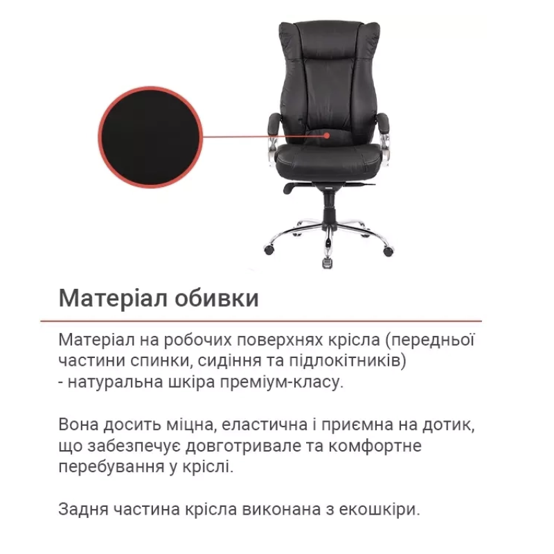 Для пошиття чохла на робочих поверхнях використовується натуральна шкіра корови, а саме на передній частині спинки, сидінні та підлокітниках.