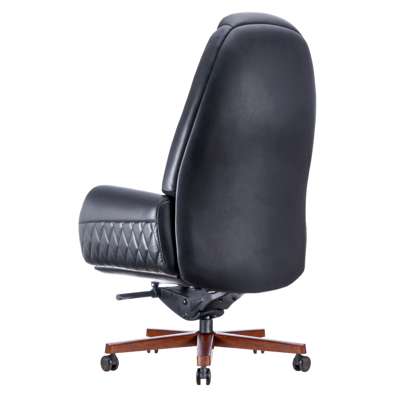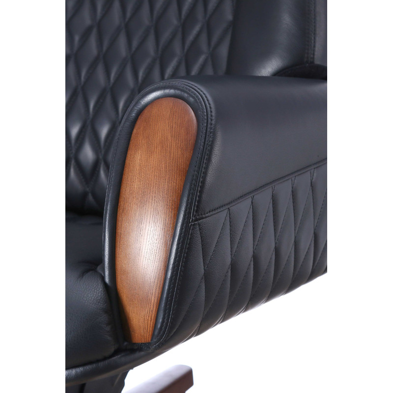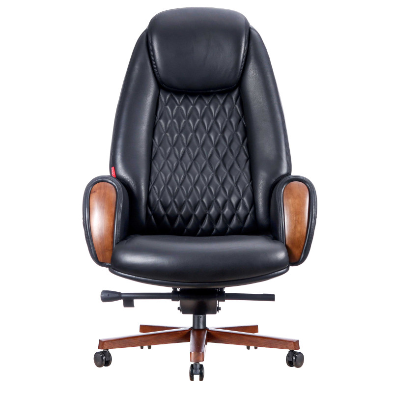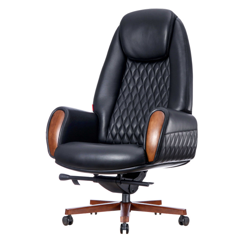 Крісло керівника Boing BL Ексклюзивне крісло керівника Boing BL – вірний вибір для створення статусної обстановки у вашому офісі чи приватному кабінеті. Представлена модель зі шкіряною оббивкою чорного кольору універсальна - вона вдало поєднуватиметься з іншими меблями будь-якого відтінку. При розробці дизайну Boing BL основний акцент зроблений на спинку, для прикраси якої використано дизайнерське прострочення, що формує невеликі ромби. Такий самий візерунок прикрашає нижні частини зовнішніх сторін потужних підлокітників. Як основа крісла використана металева опорна стійка, встановлена на чорні ролики. Промені хрестовини покриті дерев'яними накладками, що виготовлені з масиву деревини. Поліровані деталі з натурального дерева встановлені на торцях підлокітників. При розробці крісла особливу увагу приділено його ергономіці. Вигнута спинка точно повторює природні вигини хребта людини, забезпечуючи повноцінну підтримку попереку. Для бічної підтримки спини передбачено об'ємні бічні валики. У верхній частині спинки встановлений підголовник, який допомагає зняти навантаження з шийного відділу хребта під час тривалої роботи сидячої. Інакше кажучи, у цій моделі кожна деталь спрямовано забезпечення комфортної роботи під час довгого робочого дня.