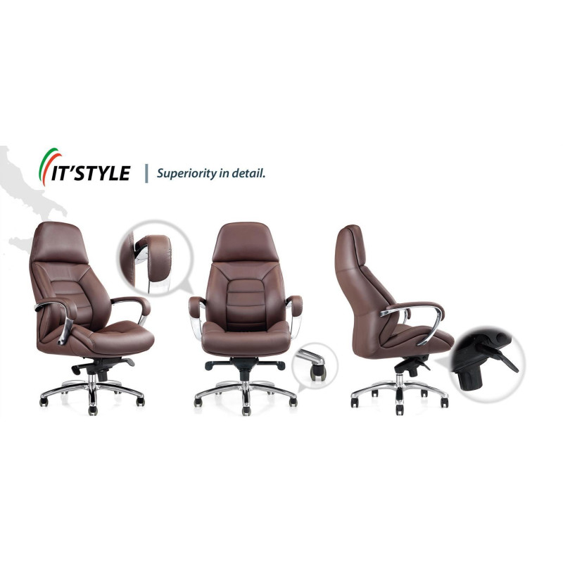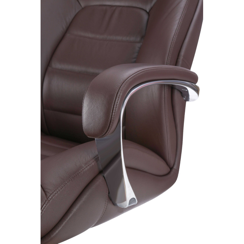 Крісло керівника F181 BRL – найкращий вибір для тих, хто віддає перевагу класичному дизайну, але цінує сучасний комфорт. В ексклюзивному кріслі продумано до дрібниць, щоб користувач не відчував фізичної втоми до кінця робочого дня. За рахунок особливої форми сидіння та спинки вдалося зробити посадку зручнішою. За допомогою дизайнерської прострочки зроблено акцент на бічних валиках, завдяки яким користувач почувається затишно. Оббивка м'яких накладок на підлокітники, спинку та сидіння виконана зі шкіри Люкс коричневого кольору. Цей матеріал забезпечує хорошу циркуляцію повітря та підлаштовується під температуру тіла людини, роблячи роботу в такому кріслі комфортною у будь-яку пору року. Можна вибрати будь-який інший колір та матеріал оббивки за умови контрактних або оптових закупівель. У стильному кріслі встановлені механізми приватного налаштування. Користувач може регулювати висоту крісла, жорсткість відхилення спинки та фіксувати її у найбільш зручному положенні.