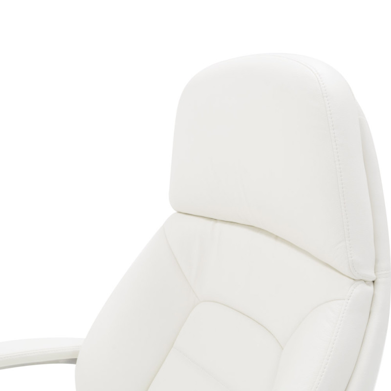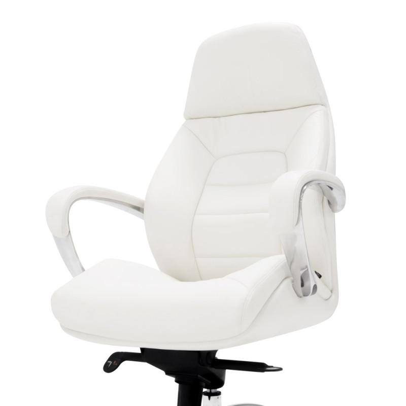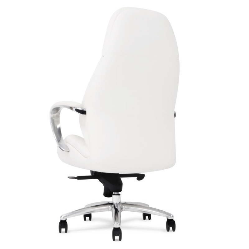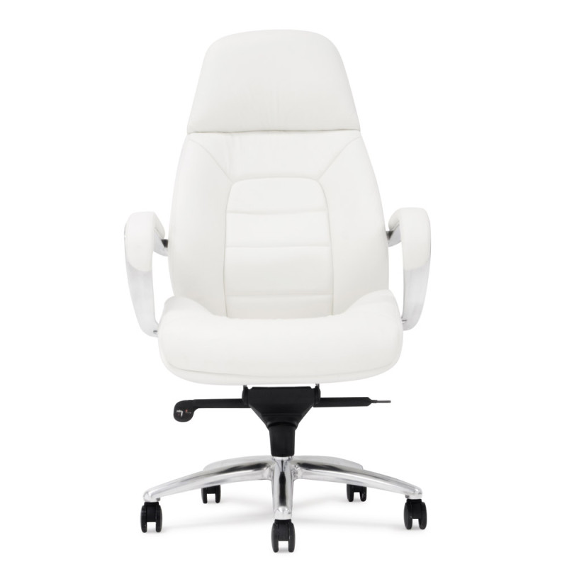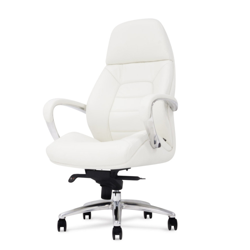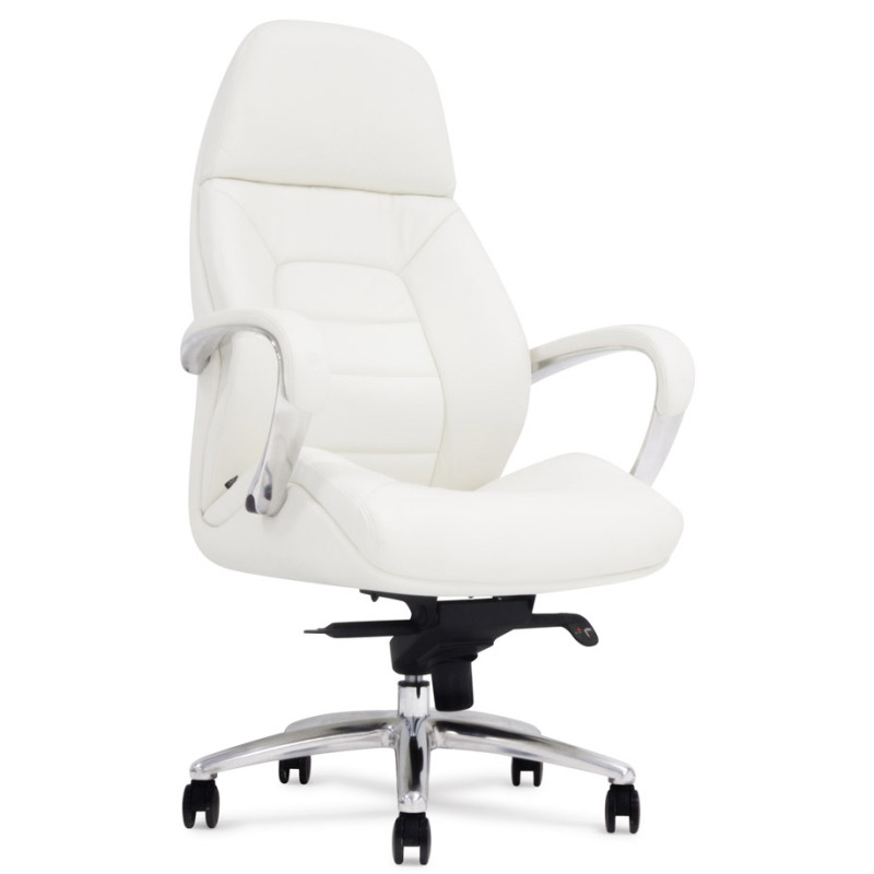 Крісло керівника F181 WL білого кольору надасть інтер'єру відчуття стабільності та солідності, завдяки чому ця модель лише позитивно позначатиметься на формуванні іміджу компанії. Спинка візуально розділена на дві частини: верхня гладка грає роль підголівника, нижня - з дизайнерським простроченням і краями, що виступають, забезпечує хорошу бічну підтримку спини. Як оббивка використана шкіра Люкс – один з найкращих матеріалів, що використовується для виробництва меблів преміум сегмента. Також цю модель можна виготовити з іншими видами оббивки інших кольорів за умови оптового або контрактного замовлення. У цій моделі передбачено все для зручності користувача. Крісло регулюється по висоті, є можливість налаштування жорсткості відхилення спинки. Металеві підлокітники доповнені м'якими накладками. Спинка та сидіння ергономічної форми – для підтримки спини у правильному положенні та попередження болю у попереку. Мобільність крісла забезпечують ролики, прикріплені до 5-променевої хромованої хрестовини. Іншими словами, тут продумано кожну деталь, щоб зробити офісну роботу максимально комфортною.