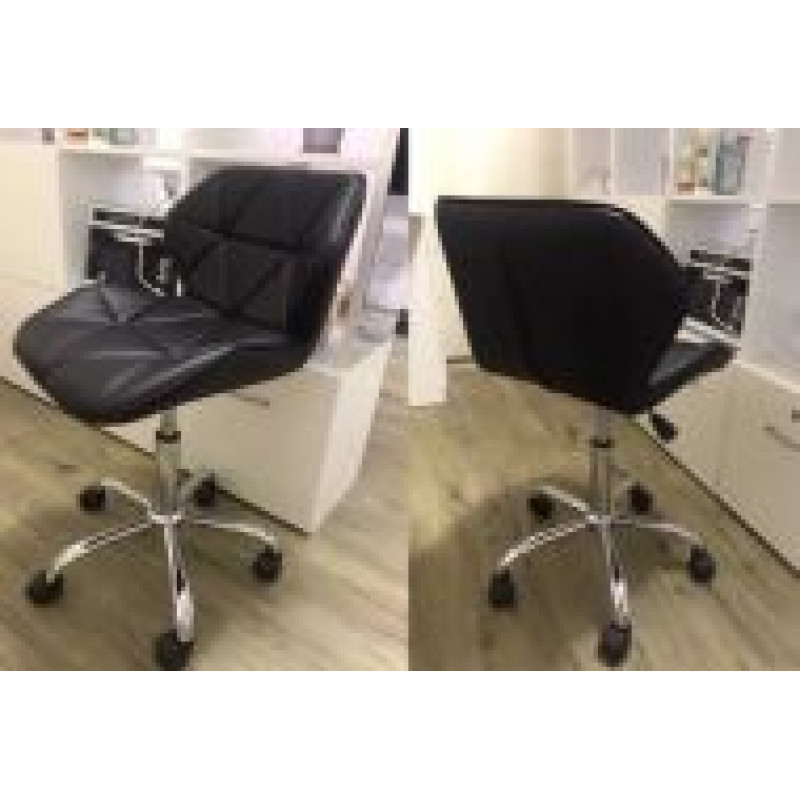 М'яке крісло, регулюється по висоті за допомогою газліфта, повертається, екошкіра, підстава хрестовина на колесах, обгумовані колеса, розмір крісла: ширина 47 см, глибина 37 см, висота регулюється від 43 см до 55 см.