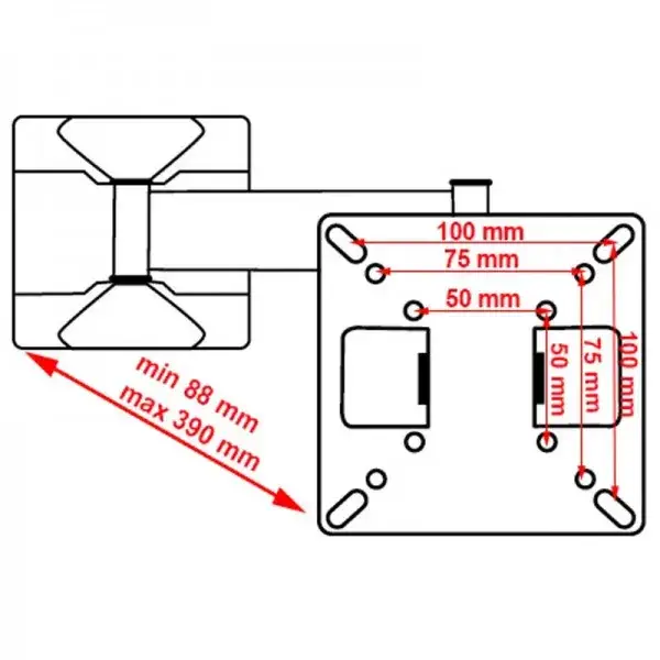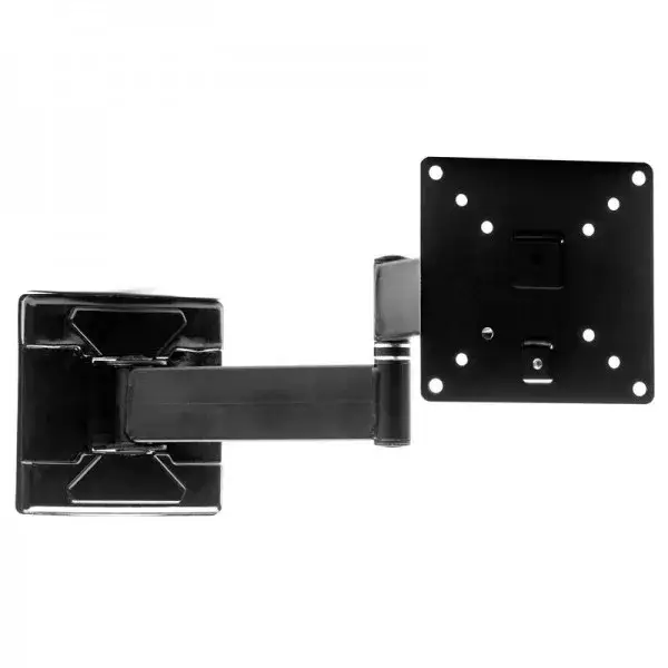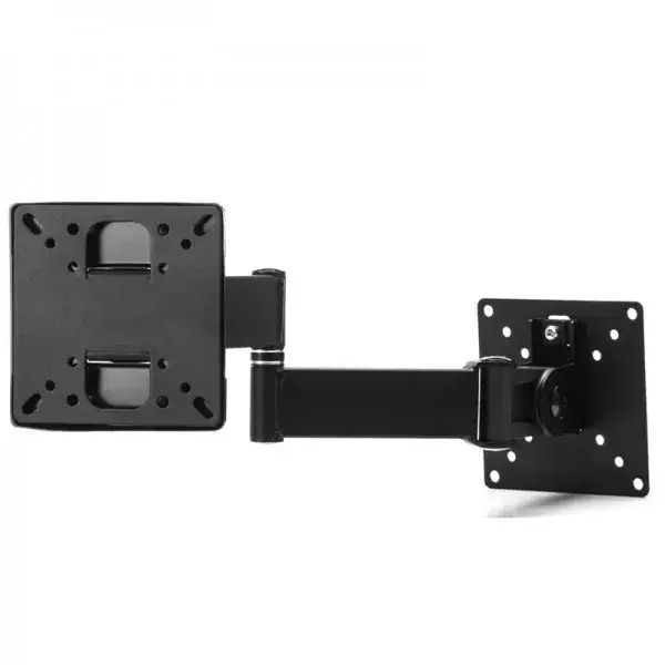 Виносне настінне кріплення, з нахилом та поворотом для 14-23"" LED, РК телевізорів та моніторів. VESA: 50x50 мм, 75x75 мм, 100x100 мм. Допустиме навантаження: 15 кг. Вага кронштейна – 1 кг Вузол нахилу: один ±70° Вузлів повороту: три, 180 ° / 360 ° / 180 ° Відстань від стіни: хв. 88 мм, макс. 390 мм. Гарантія: 7 років Матеріал: сталь. Колір чорний. особливості: високоміцні вироби завдяки технології виробництва з використанням не порошкової сталі, а листової, при холодному штампуванні відбувається додаткове ущільнення матеріалу відповідно до зміцнення виробу, збільшення стійкості до навантажень, комплектація з високоміцними наборами металовиробів. Тип з'єднання: зварювання - найміцніший вид з'єднання на сьогоднішній день