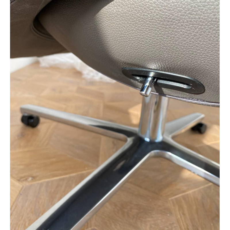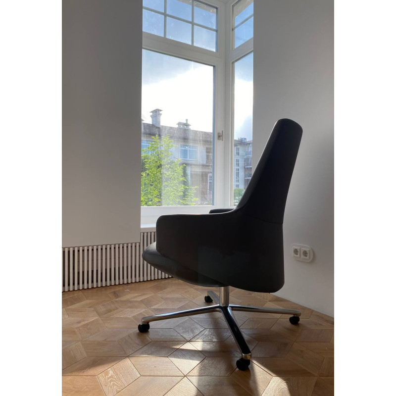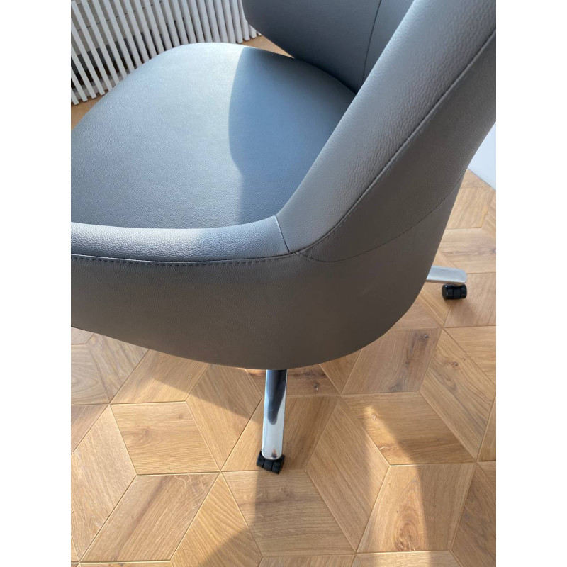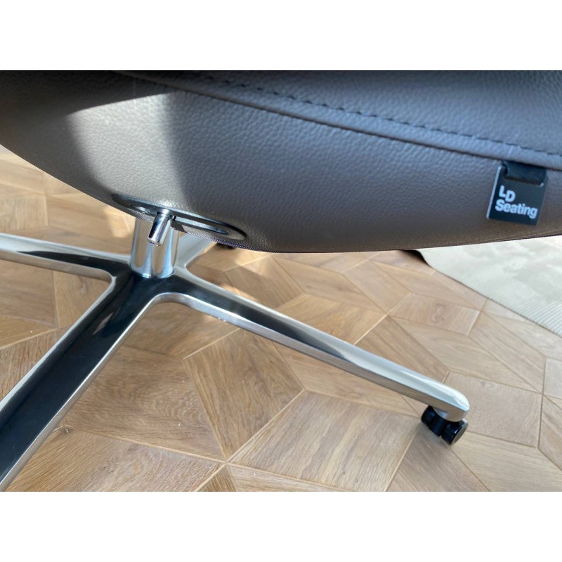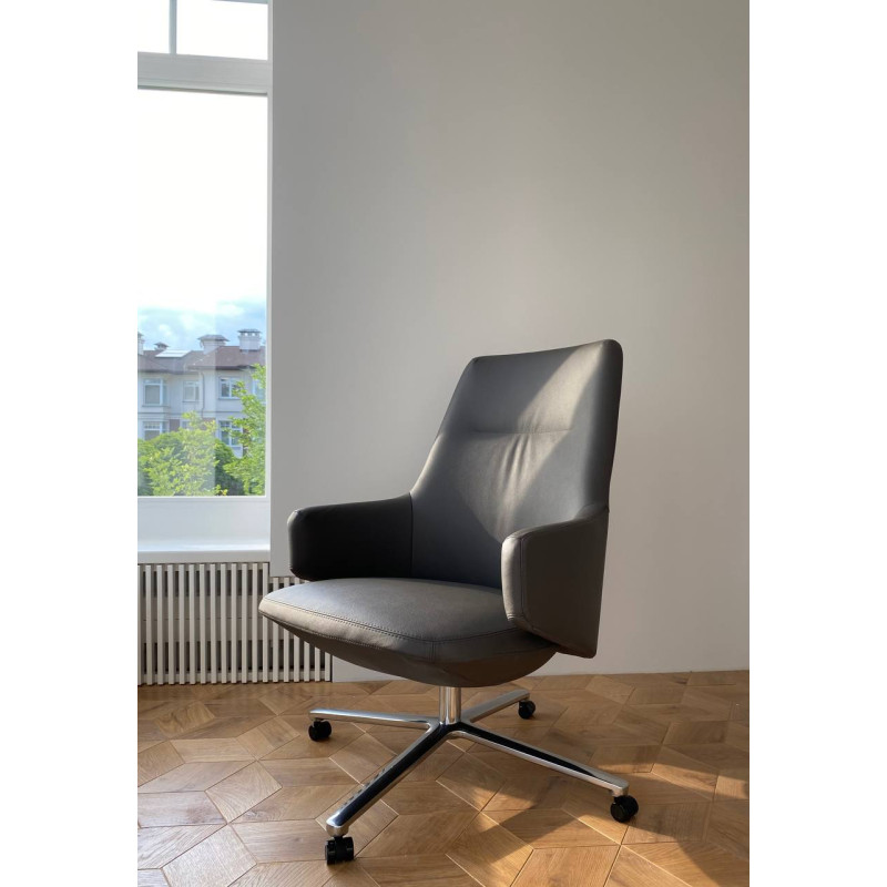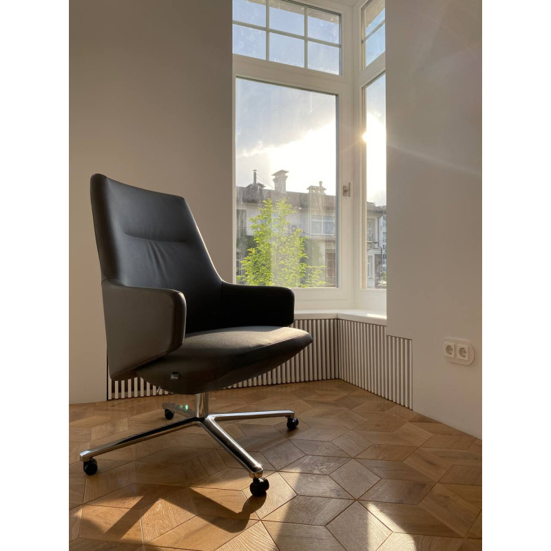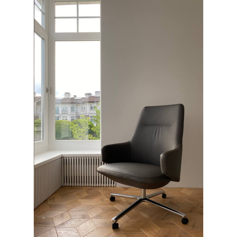 Melody Lounge - це поворотне крісло з підлокітниками, драпіроване натуральною шкірою.