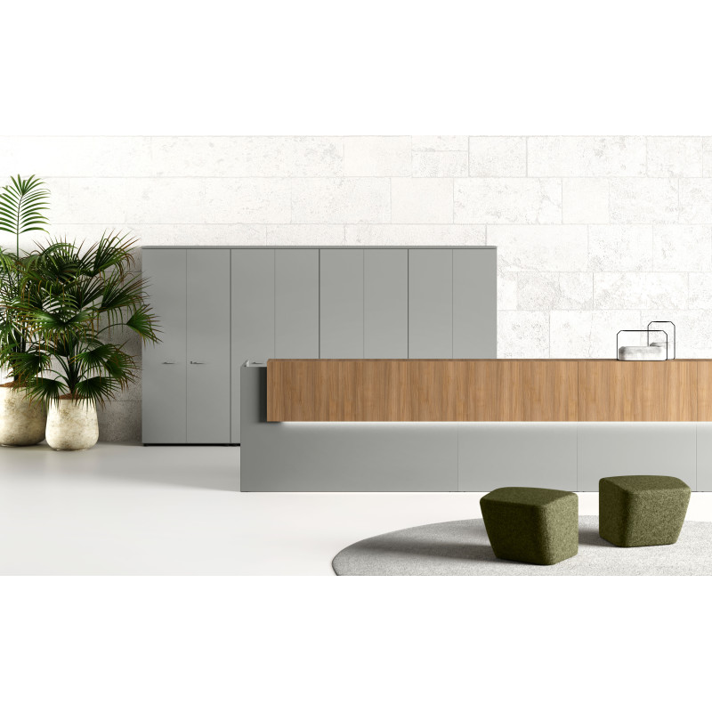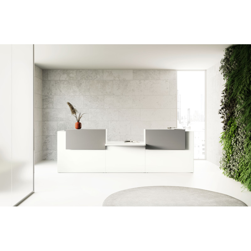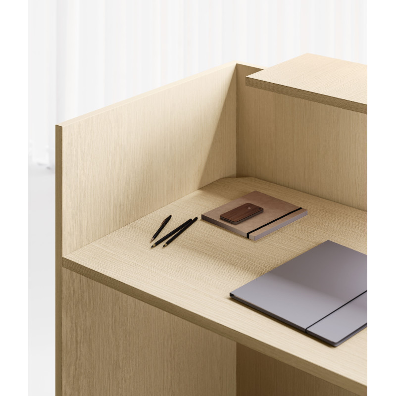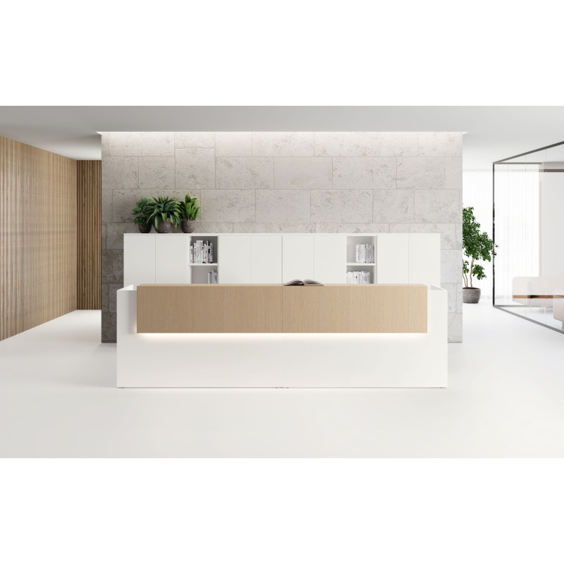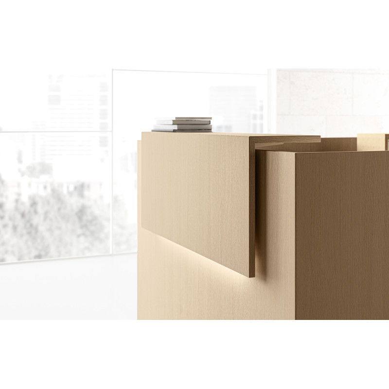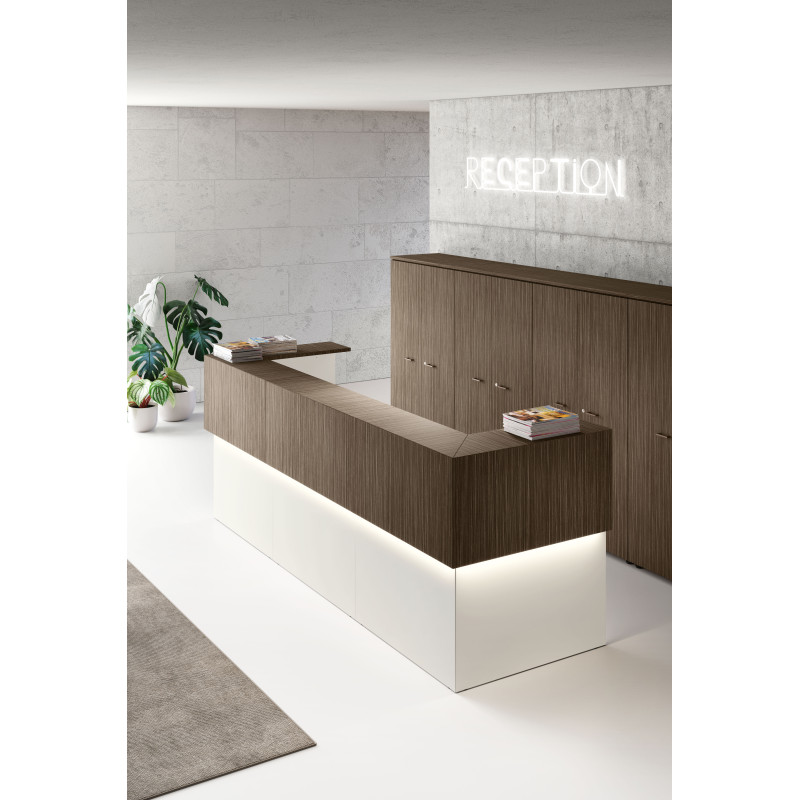 Хроматичний і матеріальний ефект металевих полиць додає цінності стійки ресепшн завдяки еволюції оригінальної лінійності цього проекту.