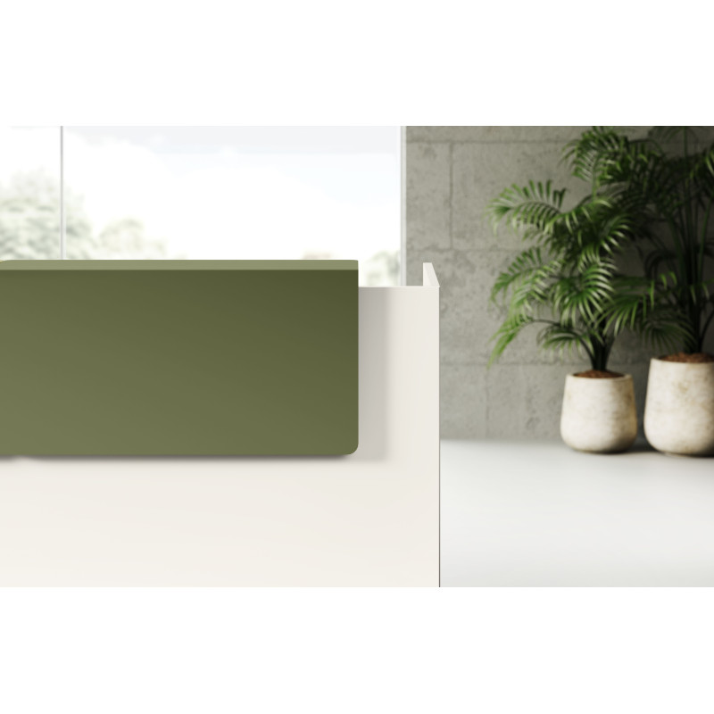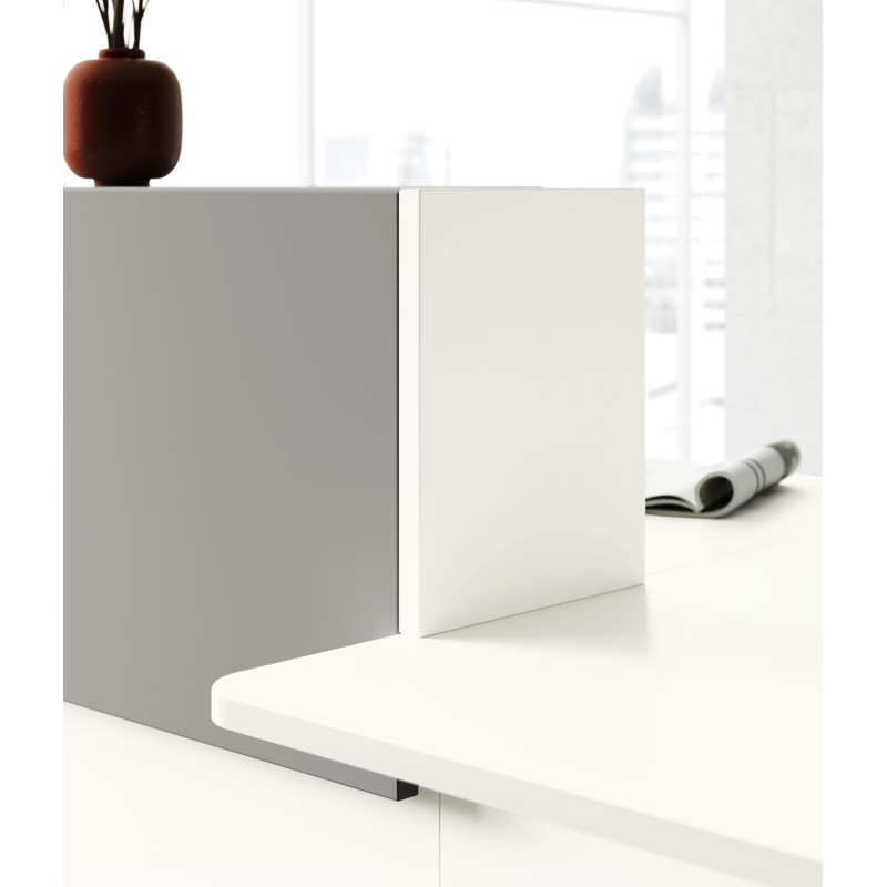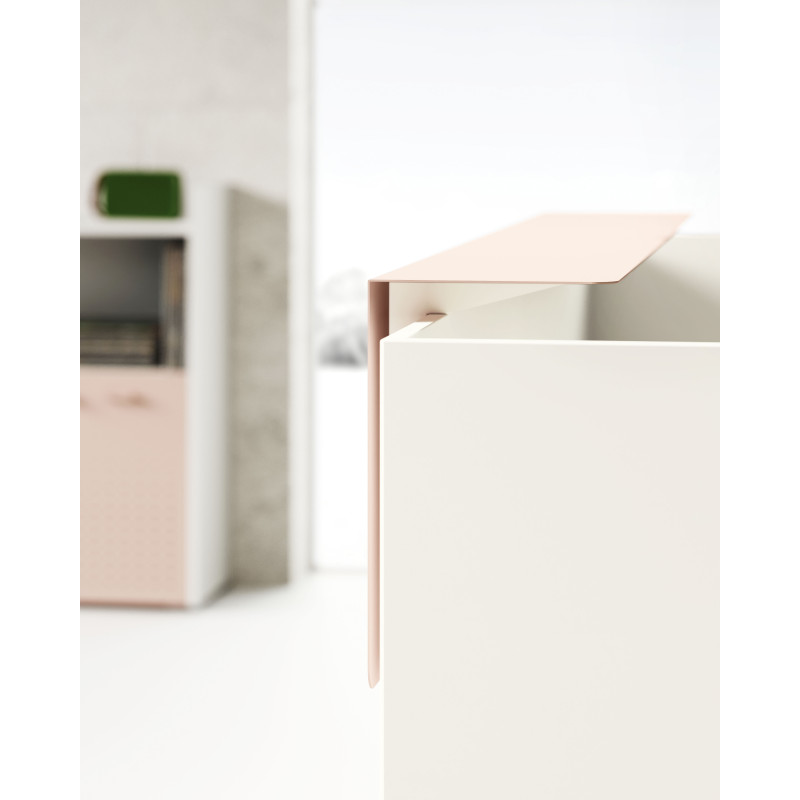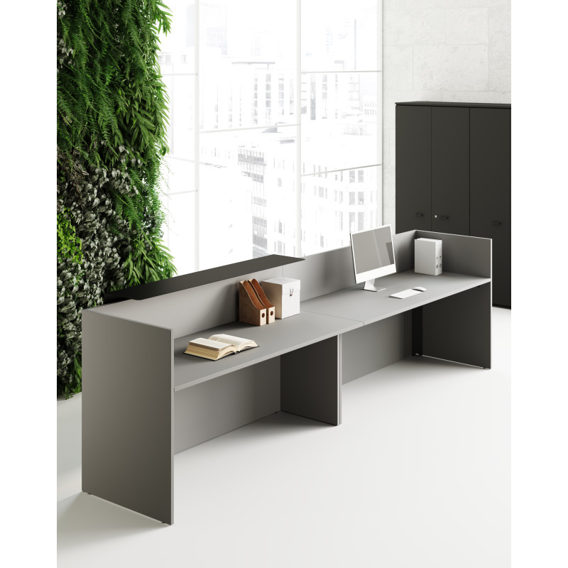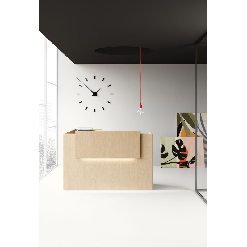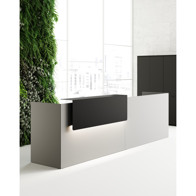 Хроматичний і матеріальний ефект металевих полиць додає цінності стійки ресепшн завдяки еволюції оригінальної лінійності цього проекту.