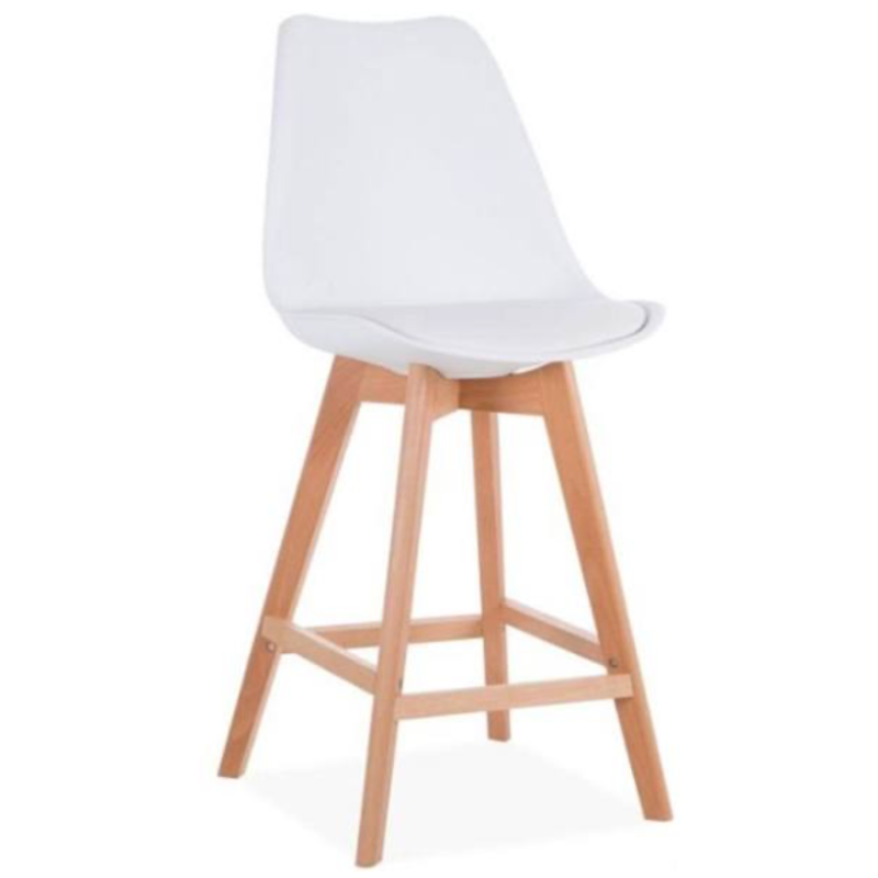 Стілець, високий, табурет, скандинавський стиль, не повертається, сидіння з пластика, м'яка подушка, подушка не знімається, висока зручна спинка, стійкі високі дерев'яні ніжки з масиву дерева, дерево бук, не регулюється по висоті, не повертається, підніжка дерев'яна, пластикові стопки для захисту підлоги від пошкоджень, розмір: висота від підлоги до верхнього краю спинки - 109 см, ширина сидіння 49 см, глибина 55 см, висота від підлоги до сидіння 68 см.