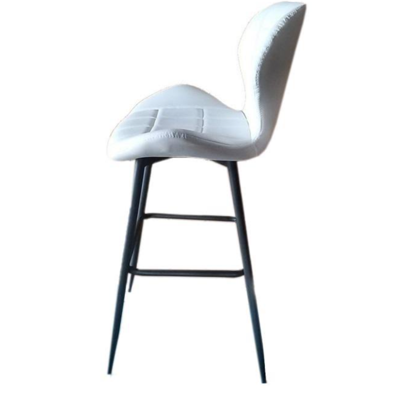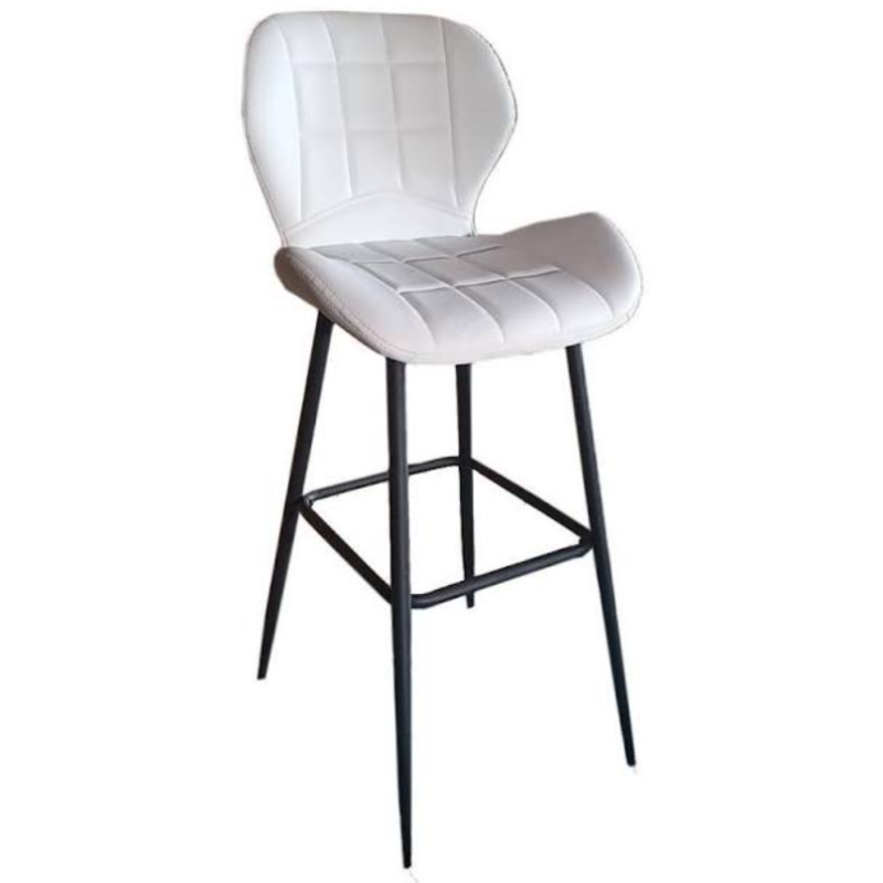 Високий барний стілець, спинка і сидіння в м'якій оббивці, прострочки по всій поверхні, підстава металева з підніжкою, фарбована в чорний колір, труба підстави кругла, барний стілець не регулюється по висоті, не повертається, розмір: ширина сидіння 47 см, глибина сидіння 37 см , висота спинки 31 см, висота посадки 76 см