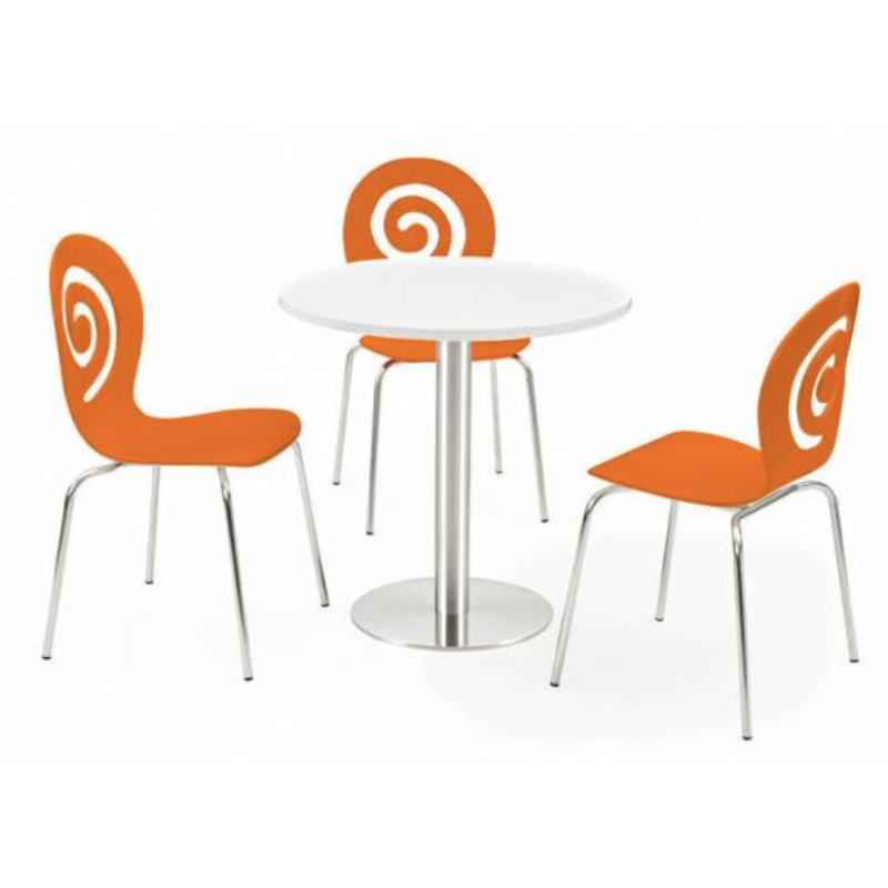 Стілець барний, сидіння виготовлено з багатошарової гнутоклеєної фанери, фанера вогнестійка, товщина фанери 12 мм з покриттям HPL ламінат високого тиску, екокраска, ніжки виготовлені з металу нержавіюча сталь, діаметр труби 19 мм, товщина металу 2 мм, під сидінням пластикові заглушки, для того, щоб стільці не дряпали один одного тоді, коли їх складають у стопки для зберігання, а також пластикові стопки на ніжках для захисту підлоги від пошкоджень, стільці ставляться в стопку по 20 шт.