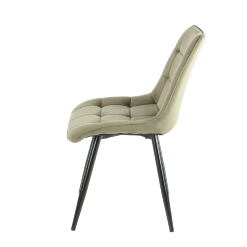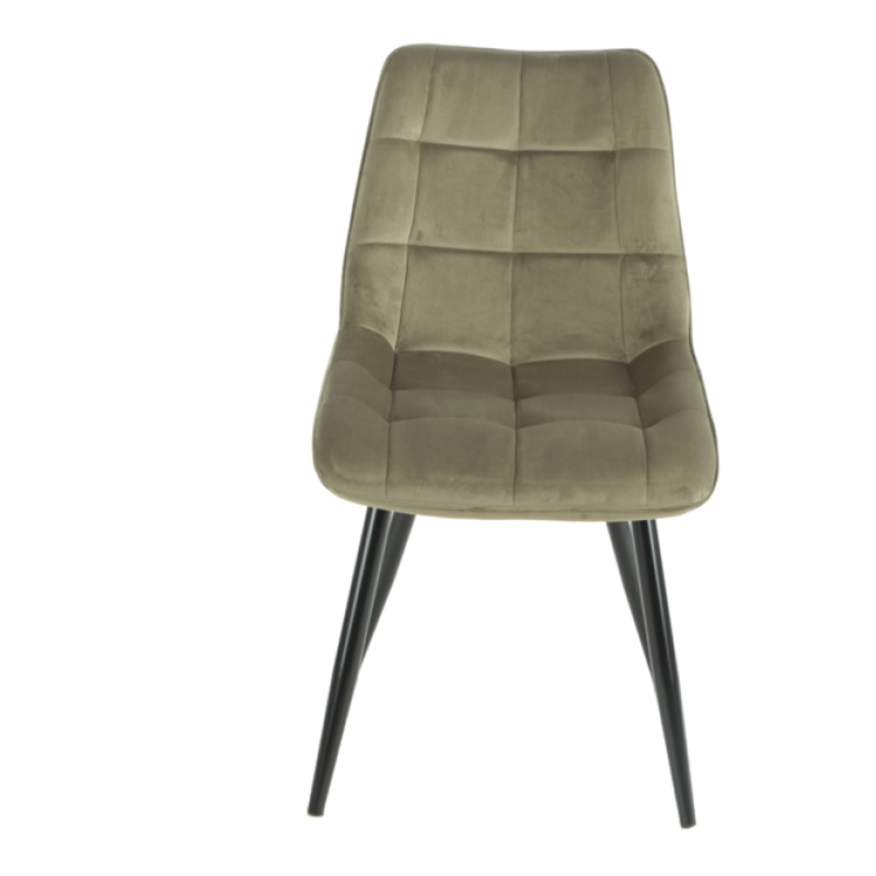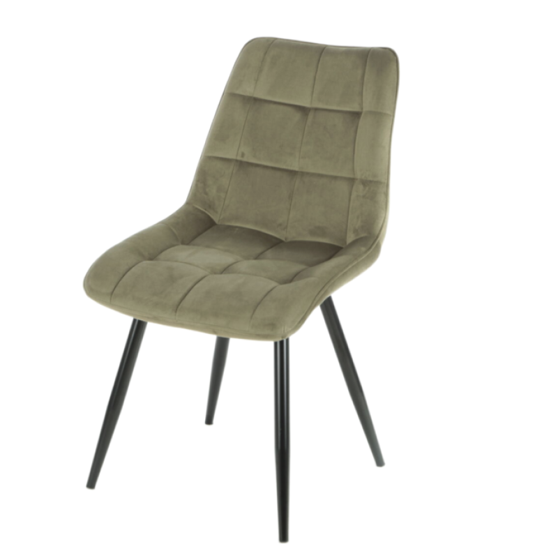Стілець CHARLIE чорний каркас/оливковийМатеріал сидіння: оксамитова тканина Матеріал каркасу: металева трубка з фарбованими ніжками під дуб Колір сидіння: темний беж Колір каркасу: дуб Розмір коробки: 61*45*65 см