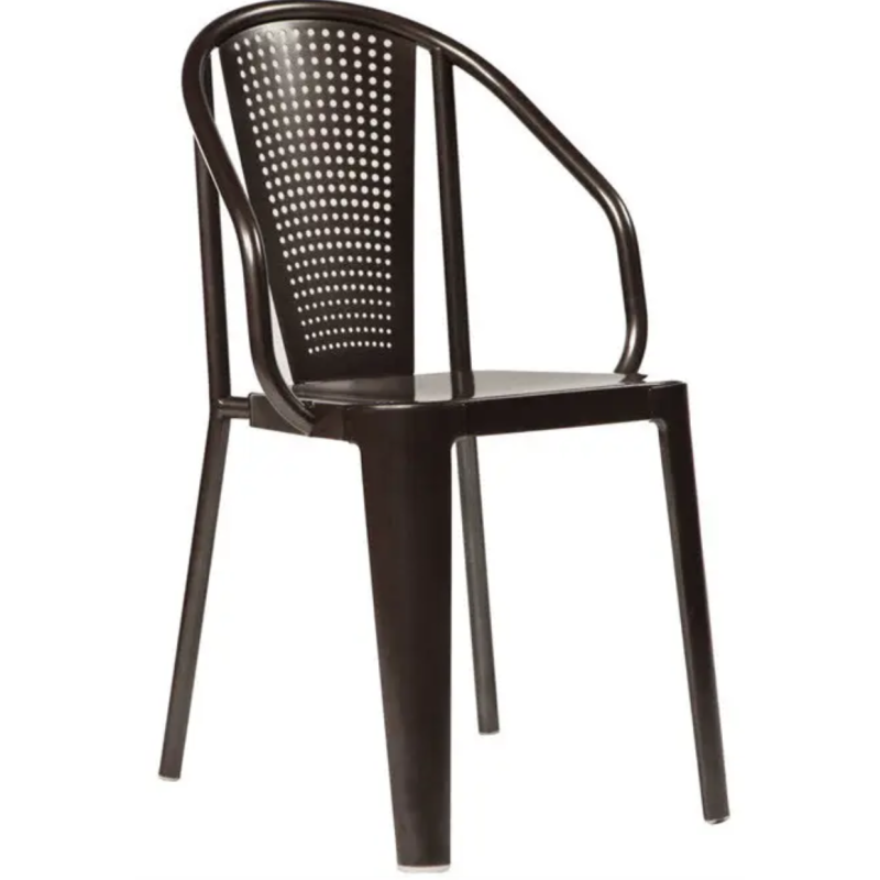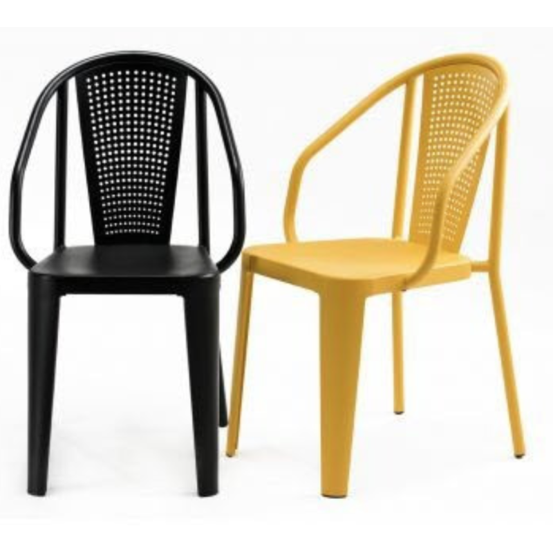 Стілець виготовлений зі сталі з порошковим покриттям, штабельований, ставиться в стопки до 30 шт. Така новинка неодмінно зацікавить гостей вашого будинку або кафе. Металевий стілець призначений для вуличного використання. Це міцний і зручний продукт. Розміри: ширина 48,5 см, глибина 58 см, висота 86 см, висота посадки 46 см.