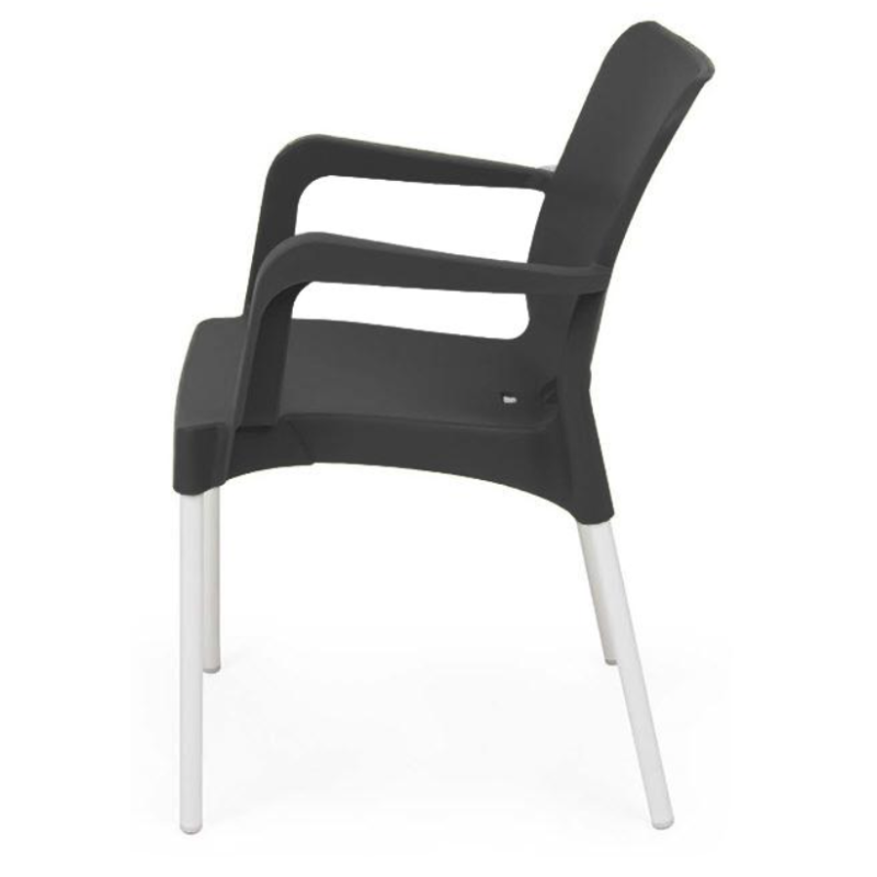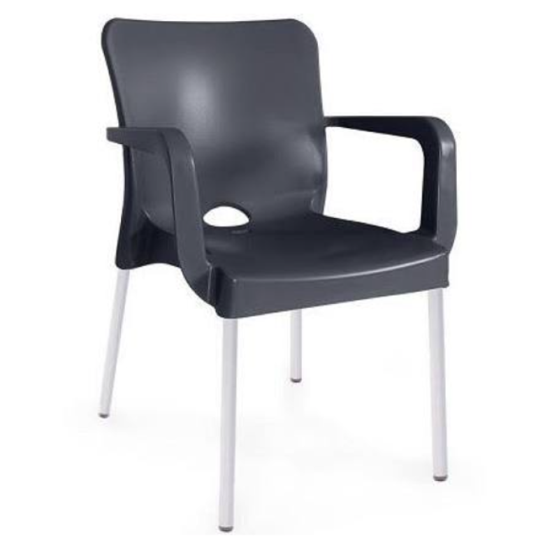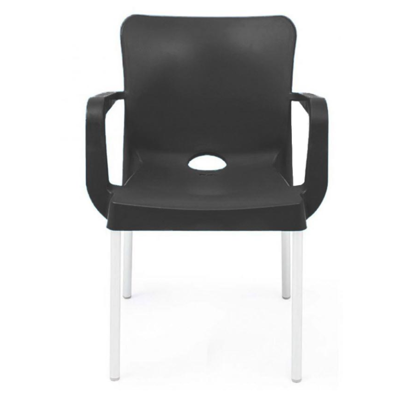Стілець пластиковий штабельований Стілець пластиковий, матеріал поліпропілен, ніжки виконані з анодованого алюмінію, стілець штабельований, ставиться в стопки до 24 штук, протиультрафіолетова обробка, антистатична обробка, дуже стійкий стілець для внутрішнього та зовнішнього використання, розмір стільця: ширина 55 см, глибина 54 см, висота від підлоги до верху спинки 81 см, висота від підлоги до сидіння 44 см. Стілець підходить для обідніх приміщень на відкритому повітрі. Йому багато років віддають перевагу такі підприємства, як їдальня, фудкорти.