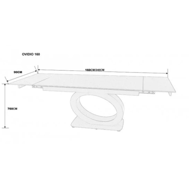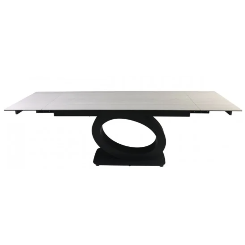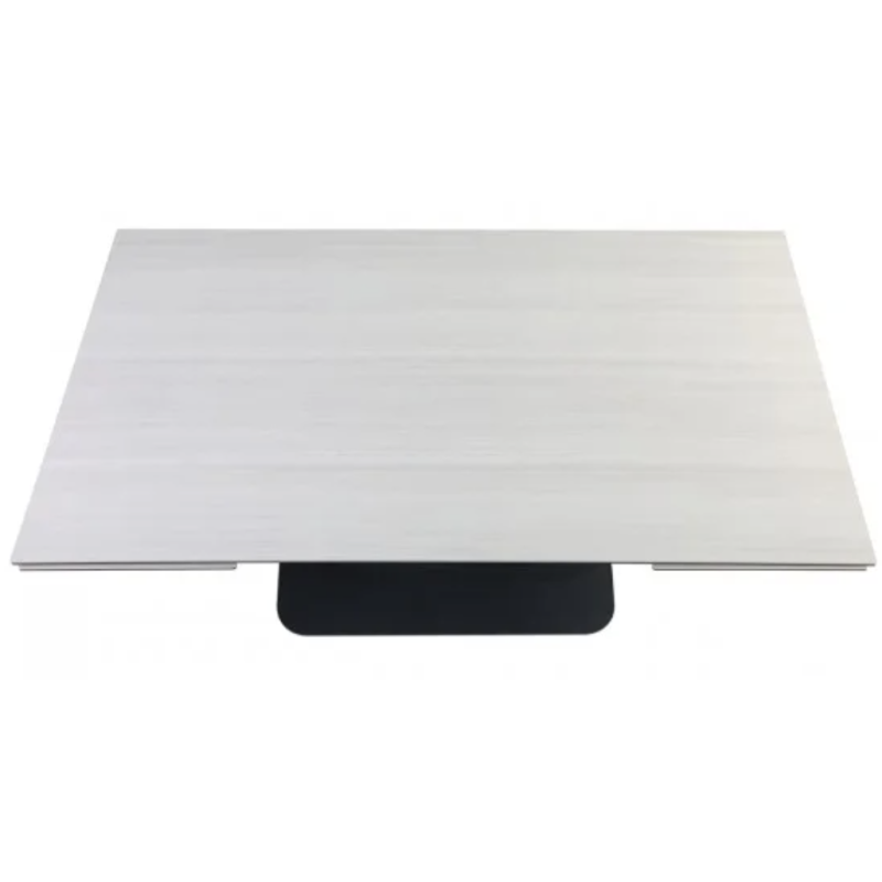 Обідній стіл OVIDIO CERAMIC 160(240)×90 – сучасна розкладна модель із прямокутною стільницею зі скла (6 мм) та кераміки (6 мм) у кольорі «білий дуб». Розміри у розкладеному вигляді – 240×90 см, висота – 76 см. Каркас – метал чорного кольору. Виробництво: Китай.