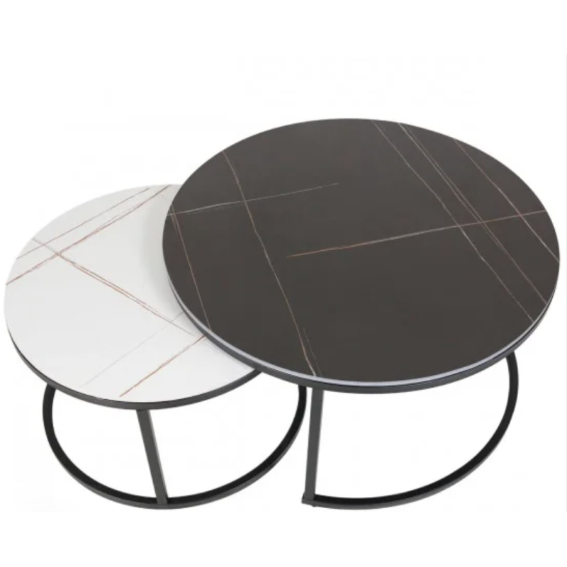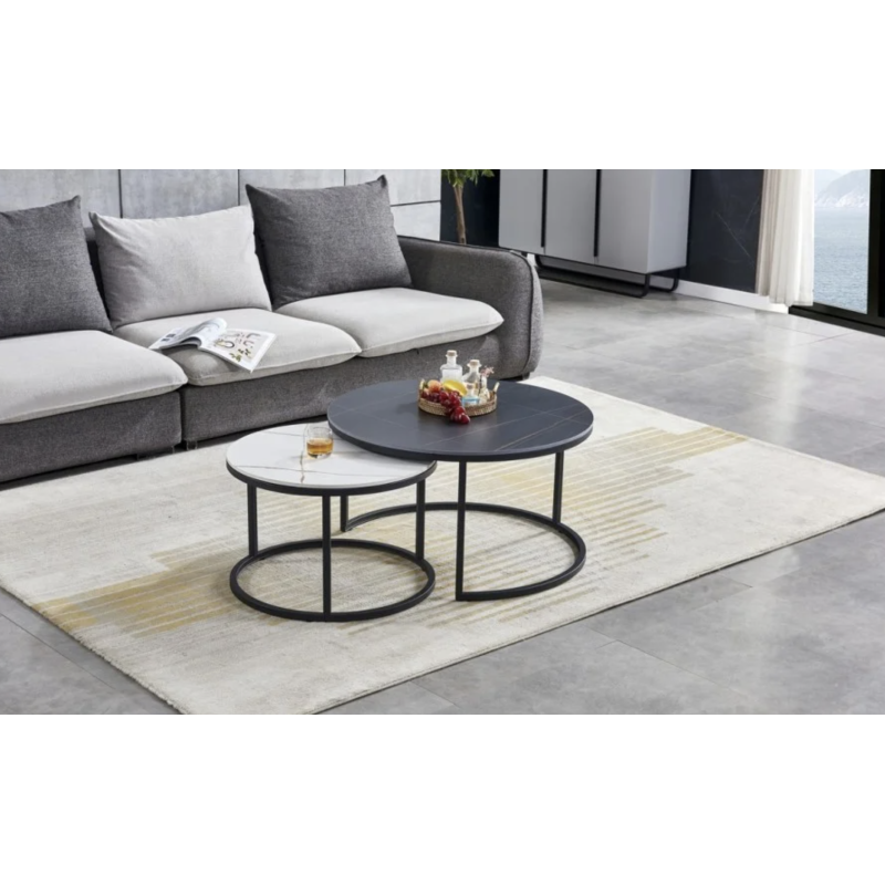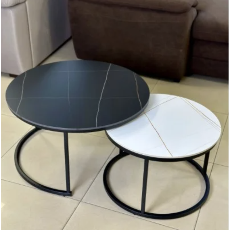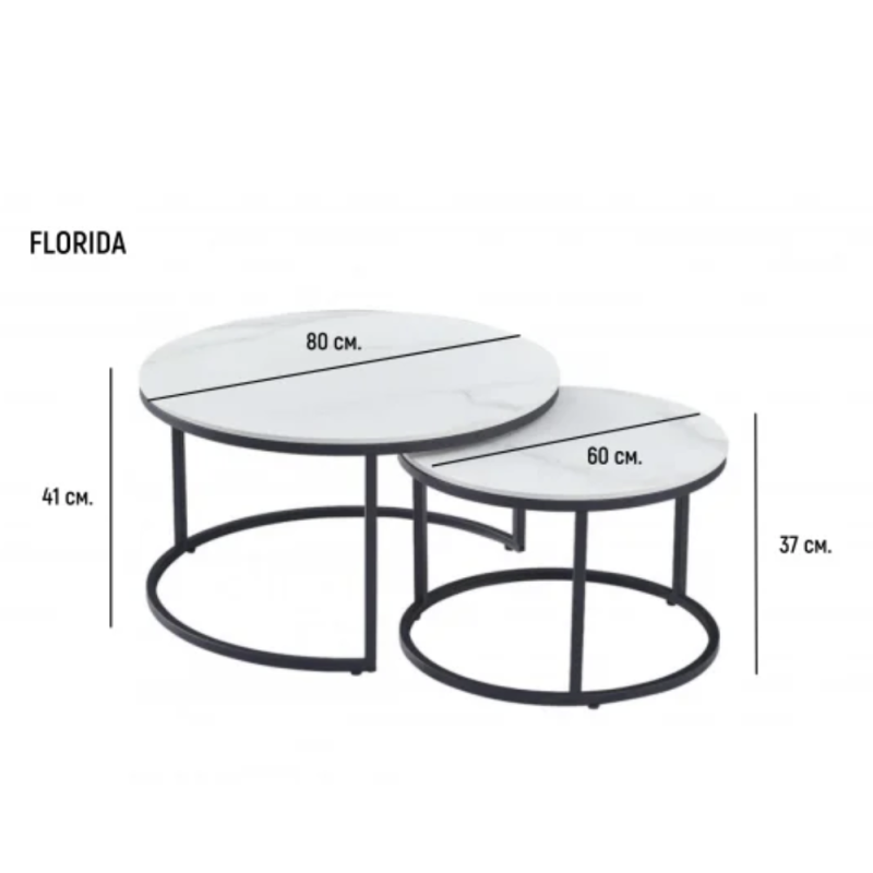 Журнальний столик FLORIDA B – стильна сучасна модель з керамічною стільницею (спечений камінь) товщиною 12 мм, у чорному та білому матовому кольорі з ефектом мармуру. Каркас виготовлений із трубчастих чорних ніжок 20×20 мм. Розміри: Ø80×41 см та Ø60×37 см. Постачається в оригінальній упаковці з інструкцією для самостійного складання.