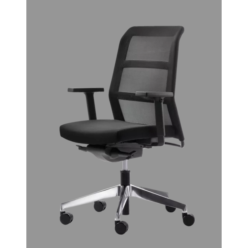 Крісло зі спинкою стандартної висоти Матеріал спинки: тканина;сітка чорного кольору (Матеріал: Trevira CS, це матеріал, який використовується на повітряних суднах та поїздах, оскільки має особливий склад, який не горить) Сидіння - тканина згідно палітри кольорів компанії Wiesner-Hager. Широке зручне сидіння з можливістю розширити посадкове місце на 6,5 см відрегулювавши кріплення підлокітників. Регулювання ширини підлокітників :615-680 мм, Регулювання жорсткості на клон Всі ці регулювання входять до базової вартості. Опір до стирання: 80 000 циклів (тест Мартіндейла) Вага: 19 кг Вага в упаковці: 23 кг Розміри упаковки: 65х65х45 см Регулювання: