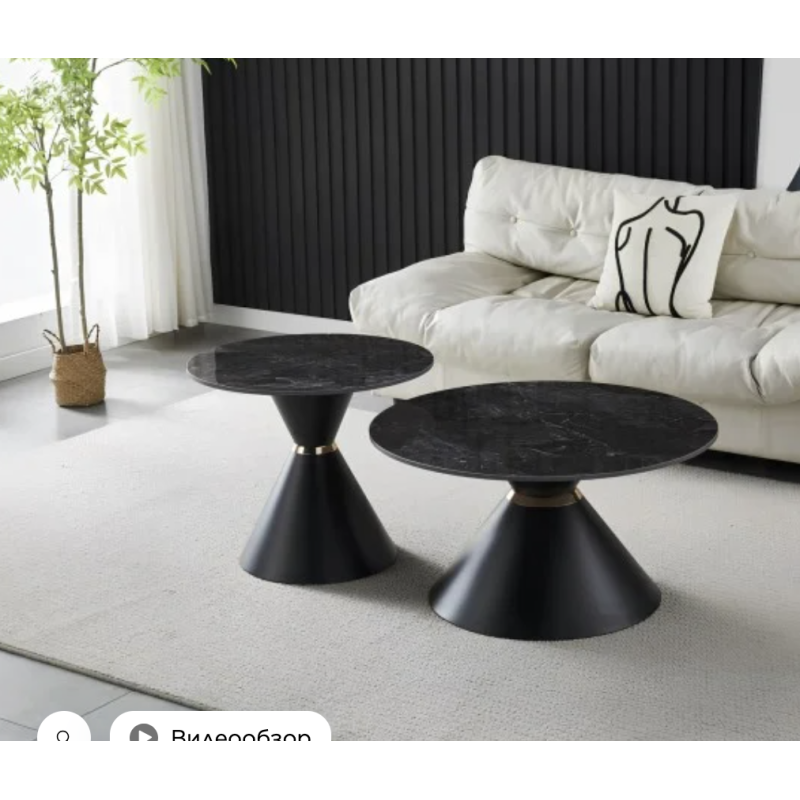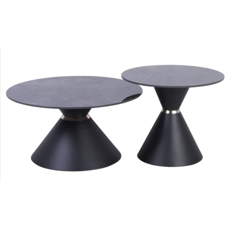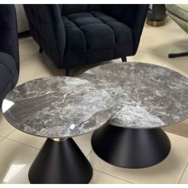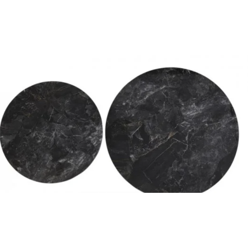 Журнальний столик CAROLINA (комплект) – сучасна модель з керамічною стільницею (11 мм) у чорному глянці з ефектом мармуру. У комплект входять два столики: Ø80 см та Ø60 см. Каркас виготовлений із піщано-чорної труби з порошковим покриттям. Постачається у коробках 87×86×7 см і 55×55×35 см.